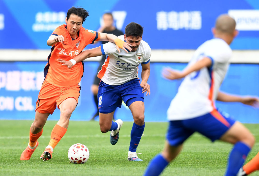 4月26日,青岛海牛队球员罗森文(左)与山东泰山队球员马德鲁加在比赛中拼抢。新华社记者 李紫恒 摄