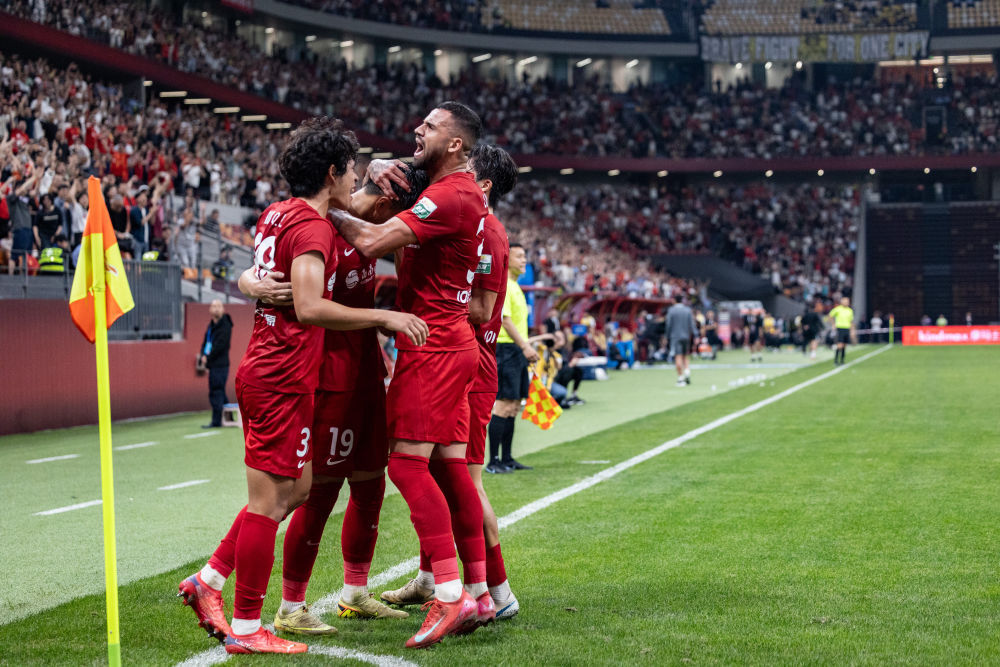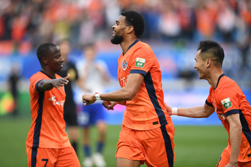 4月26日,青岛海牛队球员在比赛中庆祝进球。新华社记者 李紫恒 摄